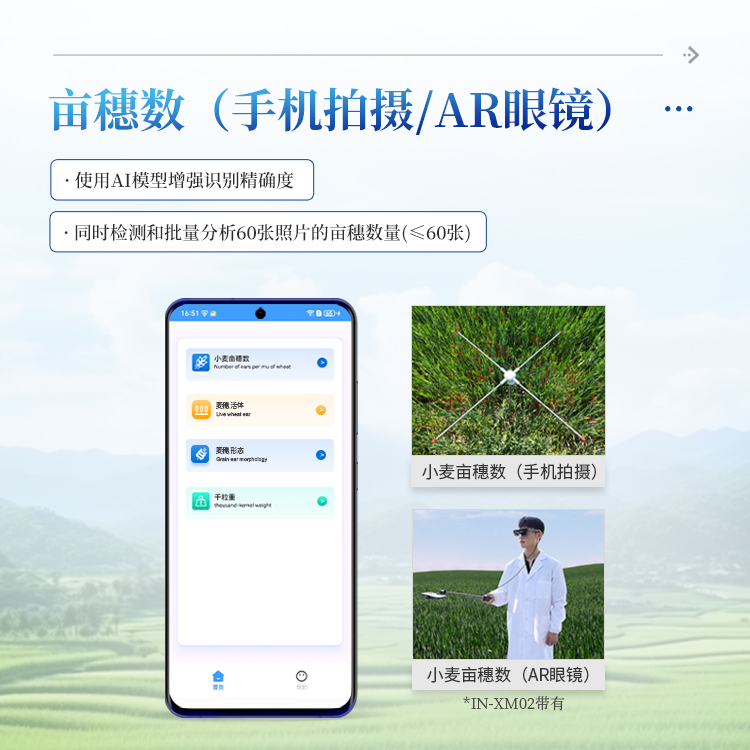 本设备适用于田间调查、育种选育、产量预估等多种应用场景,为小麦的品种筛选、小麦产量预测、产量基因定位和功能解析发挥着至关重要的作用。可显著减少人工计数带来的误差与劳动强度。用户只需在田间选定样方区域,拍摄图像后即可自动获得亩穗数估算结果,是农业数字化与智能化发展的有力工具。