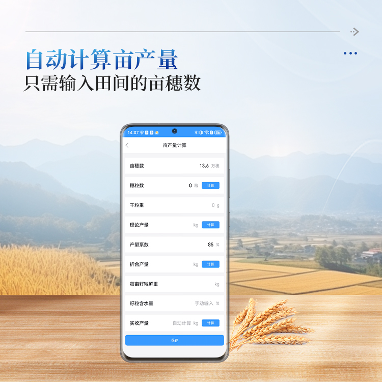 高灵活性:可以将亩穗数、穗粒数先保存数据,后期获取到千粒重后进行亩产量计算。可以灵活量用来计算折合产量和实收产量。